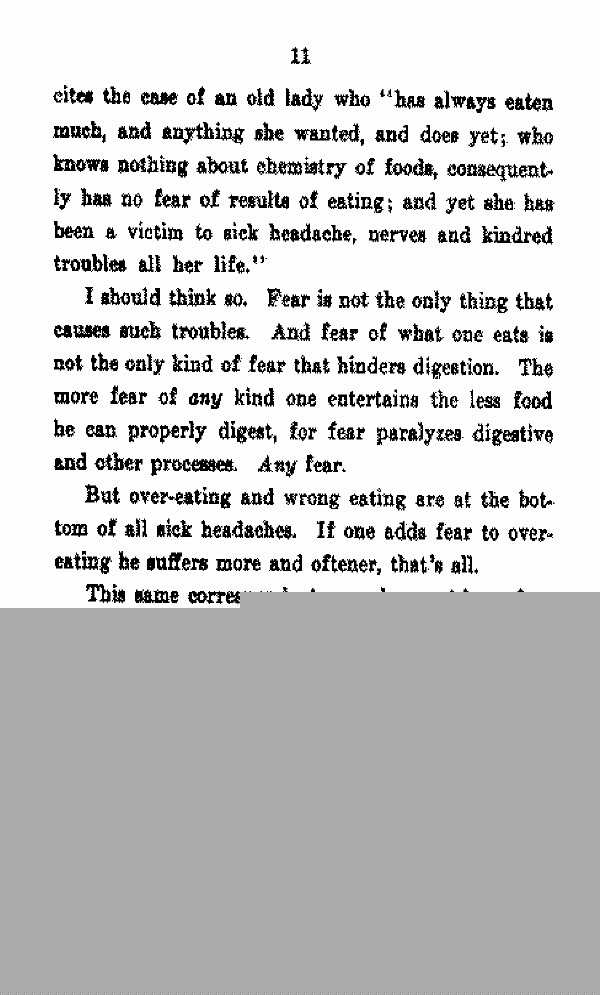 cites the case of an old lady who "has always eaten much, and anything she wanted, and does yet; who knows nothing about chemistry of foods, consequently has no fear of results of eating; and yet she has been a victim to sick headache, nerves sad kindred troubles all her life,"