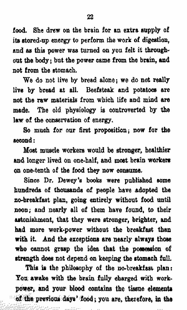 Since Dr. Dewey's books were published some Hundreds of thousands of people have adopted the no-breakfast plan, going entirely without food until noon; and nearly all of them have found, to their astonishment that they were stronger, brighter, and had more work power without the breakfast than with it. And the exceptions are nearly always those who cannot grasp the idea that the possession of strength does not depend on keeping the stomach full.