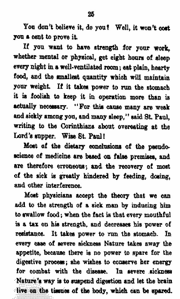 Most physicians accept the theory that we can add to the strength of a sick man by inducing him to swallow food; when the fact is that every mouthful is a tax on his strength, and decreases his power of resistance. It takes power to run the stomach. In every case of severe sickness Nature takes away the appetite, because there is no power to spare for the digestive process; she wishes to conserve her energy for combat with the disease. In severe sickness Nature's way is to suspend digestion and let the brain live on the tissues of the body, which can be spared.