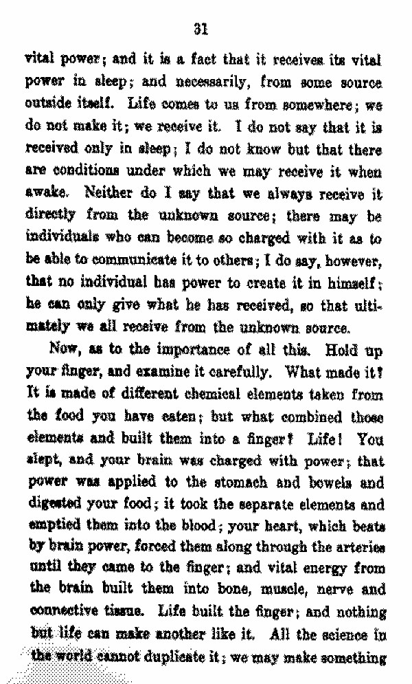 vital power; and it is a fact that it receives its vital power in deep; and necessarily, from some source outside itself. Life comes to us from somewhere; we do not make it; we receive it. I do not say that it is received only in sleep; I do not know but that there are conditions under which we may receive it when awake. Neither do I say that we always receive it directly from the unknown source; there may be individuals who can become so charged with it as to be this to communicate it to others; I do say however, that no individual has power to create it in himself he can only give what he has received, so that ultimately we will receive from the unknown source.