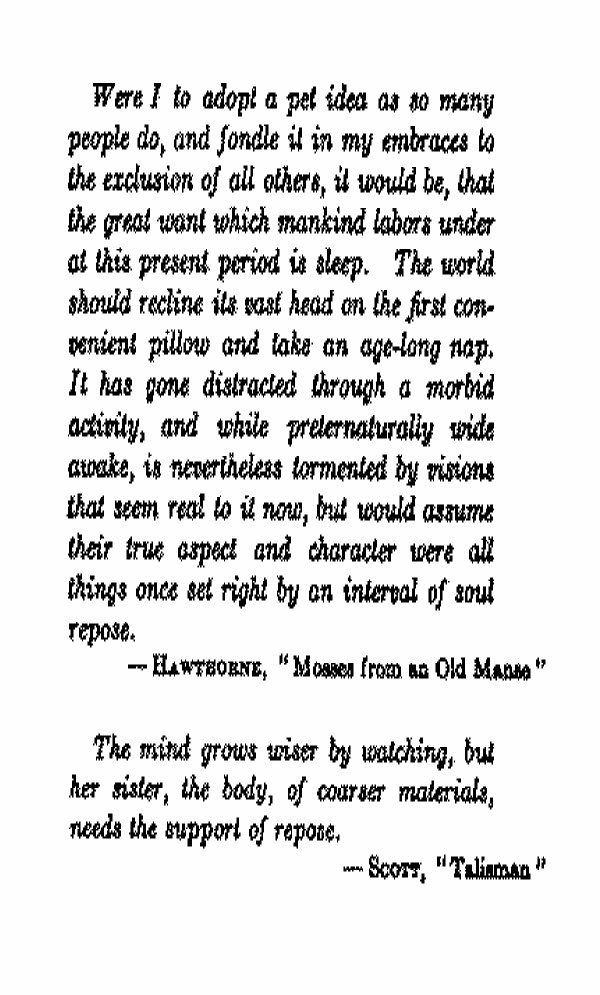 Were I to adopt a pet idea as so many people do, and fondle it in my embraces to the exclusion of ali others, it would be, that the great want which mankind labors under at this present period is sleep,. The world should recline its vast head on the first convenient pillow and take an age-long nap. It has gone distracted through a morbid activity, and while preternaturally wide awake, is nevertheless tormented by visions that seem real to it now, but would assume their true aspect and character were all things once set right by an interval of soul repose.