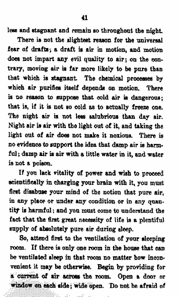 If you lack vitality of power and wish to proceed scientifically in charging your brain with it, you must first disabuse your mind of the notion that pure air, in any place or under any condition or in any quantity is harmful; and you must come to understand the fact that the first great necessity of life is a plentiful supply of absolutely pure air during sleep.