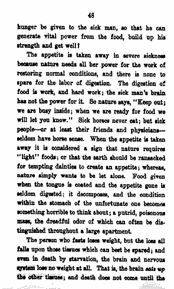 The appetite is taken away in severe sickness because nature needs all her power for the work of restoring normal conditions, and there is none to spare for the labor of digestion. The digestion of food is work, and hard work; the sick man's brain has not the power for it. So nature says, "Keep out; we are busy inside; when we are ready for food we will let you know." Sick horses never eat; but sick people --- or at least their friends and physicians seldom have horse sense. When the appetite is taken away it is considered a sign that nature requires "light" foods; or that the earth should be ransacked for tempting dainties to create an appetite; whereas, nature simply wants to be let alone. Food given when the tongue is coated and the appetite gone is seldom digested; it decomposes, and the condition within the stomach of the unfortunate one becomes something horrible to think about; a putrid, poisonous mass, the dreadful odor of which can often be distingnished throughout a large apartment.
