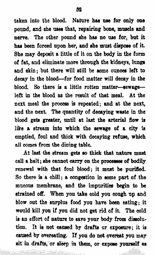 taken into the blood. Nature has use for only one pound, and she uses that, repairing bone, muscle and nerve. The other pound she has no use for, but it has been forced upon her, and she must dispose of it. She may deposit a little of it on the body in the form of fat, and eliminate more through the kidneys, lungs and skin; but there will still be some ounces left to decay in the blood --- for food matter will decay in the blood. So there is a little rotten matter --- sewage left in the blood as the result of that meal. At the next meal the process is repeated; and at the next, and the next. The quantity of decaying waste in the blood gets greater, until at last the arterial flow is like a stream into which the sewage of a city is emptied, foul and thick with decaying refuse, which all comes from the dining table.