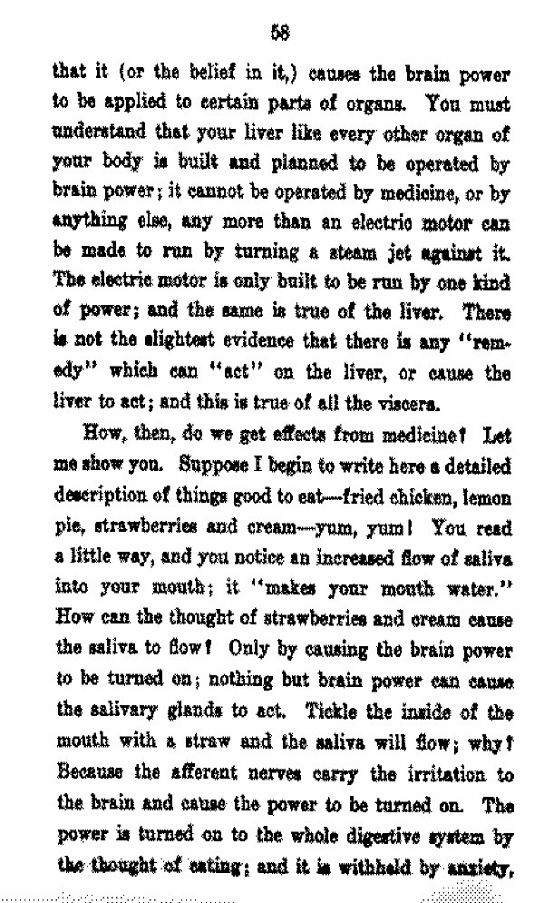 How, then, do we get effects from medicine! Let me show you. Suppose I begin to write here a detailed description of things good to eat --- fried chicken, lemon pie strawberries and cream --- yum, yum! You read a little way, and you notice an increased flow of saliva into your mouth; it "makes your mouth water." How can. the thought of strawberries and cream cause the saliva to flow! Only by causing the brain power to be turned on; nothing but brain power an cause the salivary glands to act. Tickle the inside of the mouth with s straw and the saliva will flow; why? Because the afferent nerves carry the irritation to the brain and cause the power to be turned on. The power is turned on to the whole digestive system by the thought eating.; and it is withheld by anxiety,
