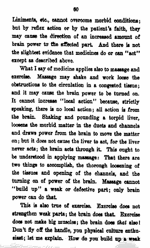 What I say of medicine applies also to massage and exercise. Massage may shake and work loose the obstructions to the circulation in a congested tissue; and it may cause the brain power to be turned on. It cannot increase "local action" because, strictly speaking, there is no local action; all action is from the brain. Shaking and pounding a torpid liver, loosens the morbid matter in the ducts and channels and draws power from the brain to move the matter on; but it does not cause the liver to act, for the liver never acts; the brain acts through it. This ought to be understood in applying massage: That there are two things to accomplish, the through loosening of the tissues and opening of the channels and the turning on of power of the brain. Massage cannot "build up" a weak or defective part; only brain power can do that. This is also true of exercise, Exercise does not strengthen weak parts; the brain does that. Exercise does not make big muscles; the brain does that also! Don't fly off the handle, you physical culture enthusiast; let me expiain. How do you build up a weak