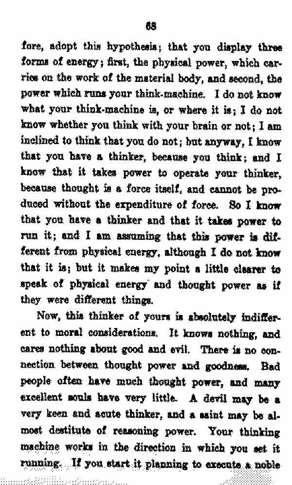 adopt this hypothesis; that you display three forms of energy; first, the physical power, which carries on the work of the material body, and second, the power which runs your think-machine. I do not know what your think machine is, or where it is; I do not know whether you think with your brain or not; I am inclined to think that you do not; but anyway, I know that you have a thinker, because you think; and I know that it takes power to operate your thinker, because thought is a force itself, and cannot be produced without the expenditure of force. So I know that you have a thinker and that it takes power to run it; and I am assuming that this power is different from physical energy, although I do not know that it is; but it makes my point a little clearer to speak of physical energy and thought power as if they were diffennt things.
