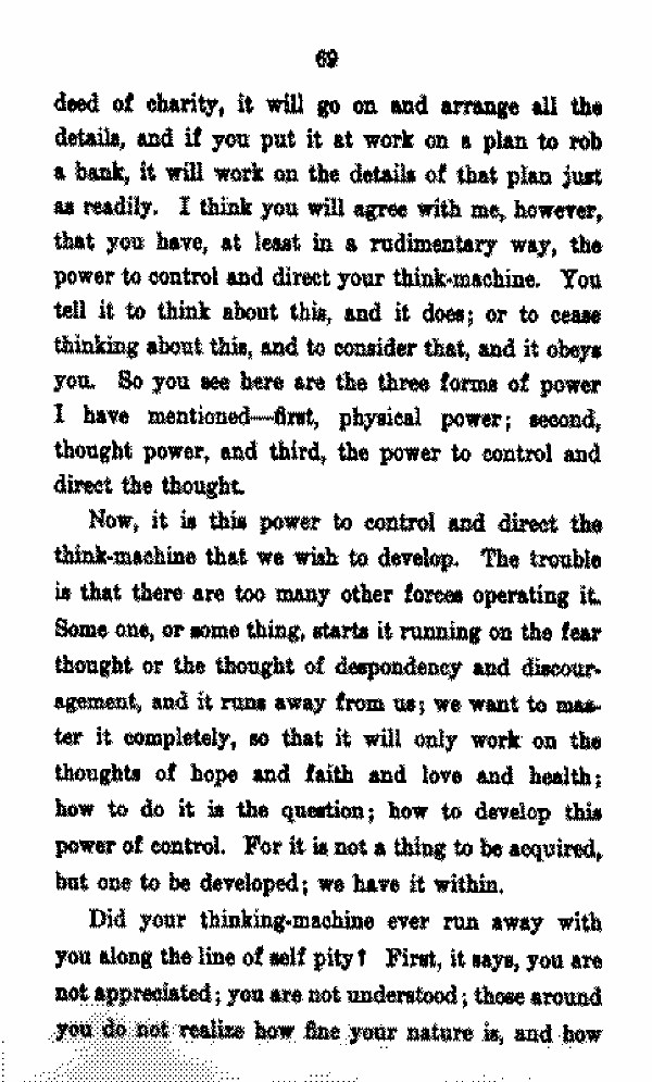 deed of charity, it will go on we arrange all the details, and if you put it at work on a plan to rob a bank, it will work on the details of that plan just as readily. I think you will agree with me, however, that you have, at least in a rudimentary way, the power to control and direct your think-machine. You tell it to think about this, and it does; or to cease thinking about this, and to consider that, and it obeys you. So you see here are the three forms of power I have mentioned --- first, physical power; second, thought power, and third, the power to control and direct the thought