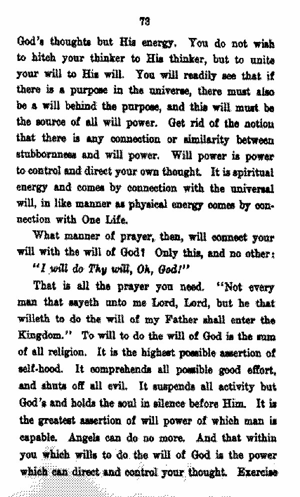 That is all the prayer you need. "Not every man that sayeth unto me Lord, Lord, but be that willeth to do the will of my Father shall enter the Kingdom." To will to do the will of God is the sum of all religion. It is the highest possible assertion of selfhood. It comprehends all possible good effort, and shuts off all evil. It suspends all activity but God's and holds the soul in silence before him. It is the greatest assertion of will power of which man is capable. Angels can do no more. And that within you which wills to do the will of God is the power which can direct and control your thought. Exercise