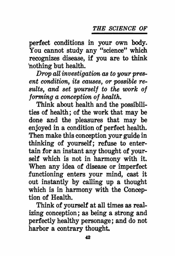 Drop all investigation as to your present condition, its causes, or possible results, and set yourself to the work of forming a conception of health.