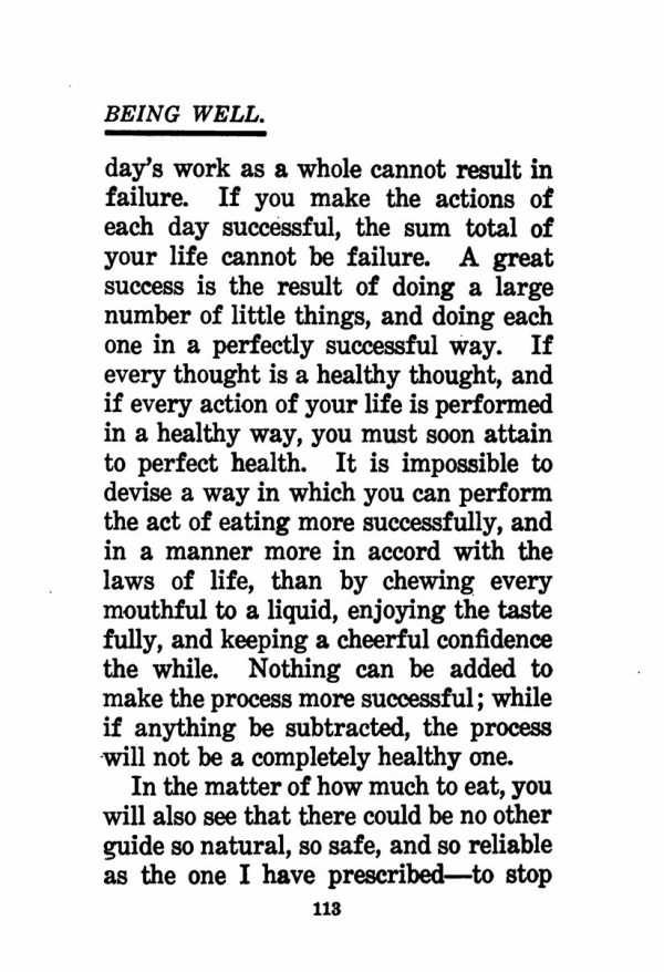 day's work as a whole cannot result in failure. If you make the actions of each day successful, the sum total of your life cannot be failure. A great success is the result of doing a large number of little things, and doing each one in a perfectly successful way. If every thought is a healthy thought, and if every action of your life is performed in a healthy way, you must soon attain to perfect health. It is impossible to devise a way in which you can perform the act of eating more successfully, and in a manner more in accord with the laws of life, than by chewing every mouthful to a liquid, enjoying the taste fully, and keeping a cheerful confidence the while. Nothing can be added to make the process more successful; while if anything be subtracted, the process will not be a completely healthy one.