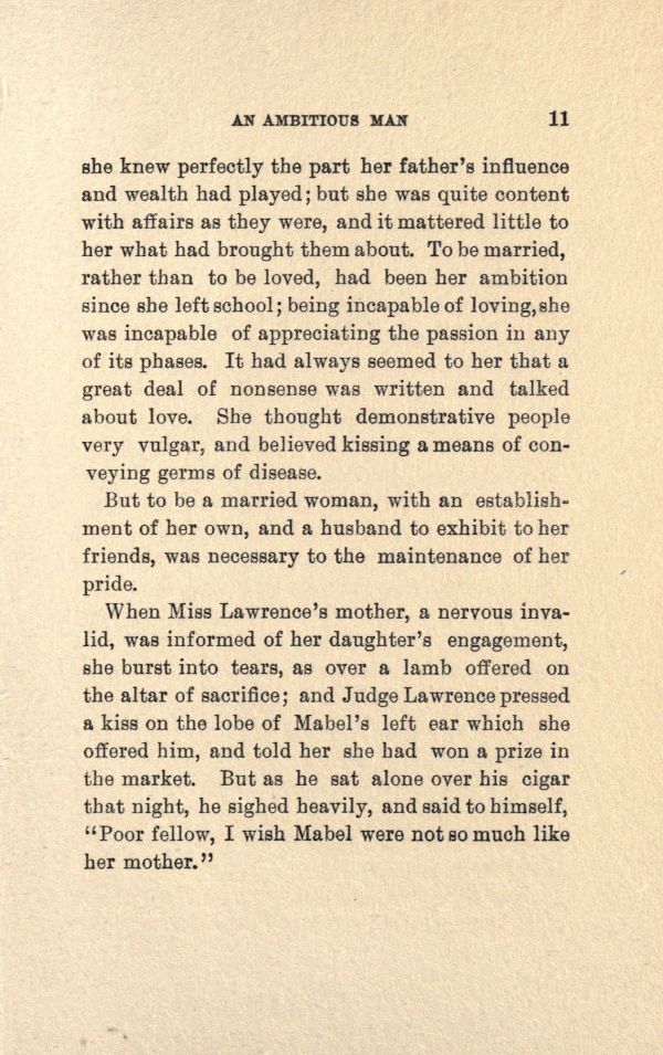 she knew perfectly the part her father's influence and wealth bad played; but she was quite content with affairs as they were, and it mattered little to her what bad brought them about. to be married, rather than to be loved, bad been her ambition since she left school; being incapable of loving, she was incapable of appreciating the passion in any of its phases. It had always seemed to her that a great deal of nonsense was written and talked about love. She thought demonstrative people very vulgar, and believed kissing a means of conveying germs of disease.