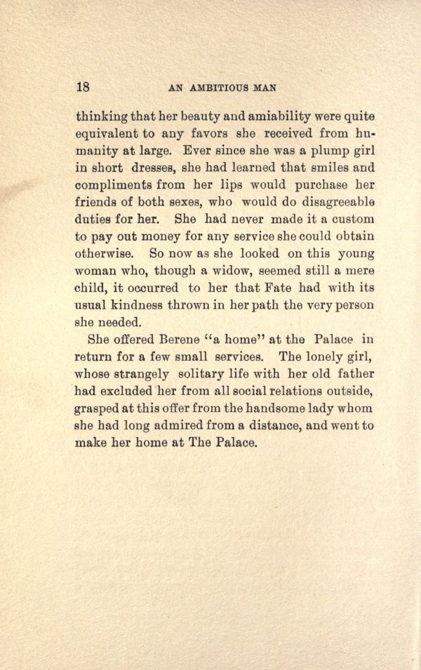 She offered Berene "a home" at the Palace in return for a few small services. The lonely girl, whose strangely solitary life with her old father had excluded her from all social relations outside, grasped at this offer from the handsome lady whom she bad long admired from a distance, and went to make her home at The Palace.
