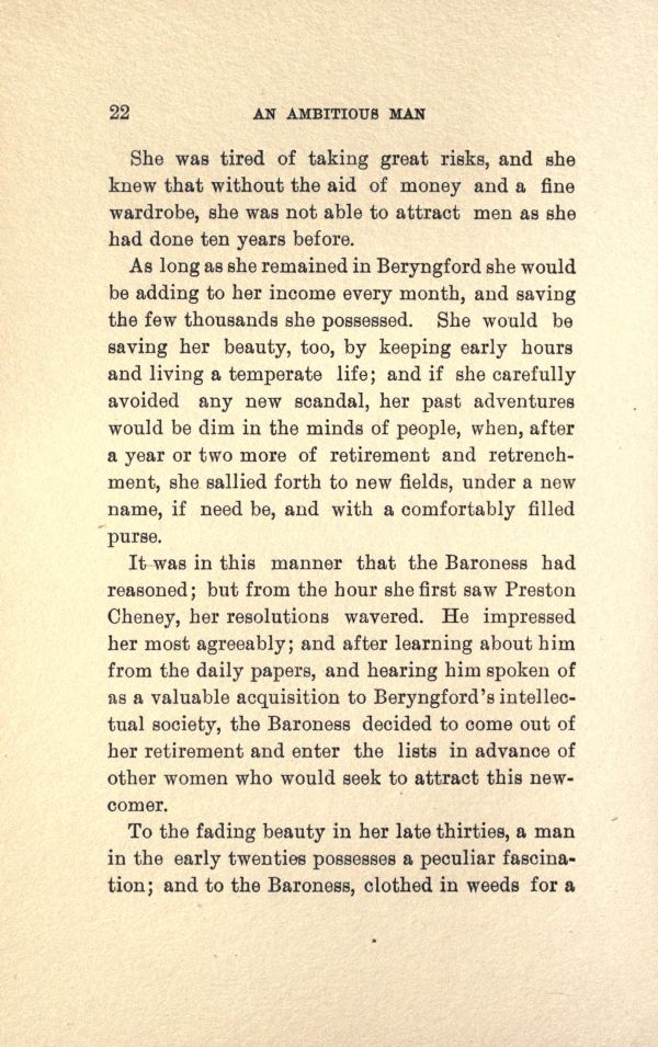 It was in this manner that the Baroness had reasoned; but from the hour she first saw Preston Cheney, her resolutions wavered. He impressed her most agreeably; and after learning about him from the daily papers, and hearing him spoken of as a valuable acquisition to Beryngford's intellectual society, the Baroness decided to come out of her retirement and enter the lists in advance of other women who would seek to attract this new comer.