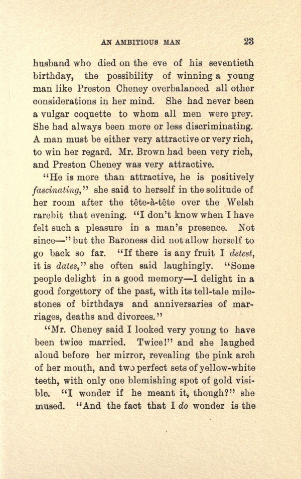 "He is more than attractive, he is positively fascinating," she said to herself in the solitude of her room after the tete-a-tete over the Welsh rarebit that evening." I don't know when I have felt such a pleasure in a man's presence. Not since'" but the Baroness did not allow herself to go back so far. " If there is any fruit I detest, it is dates," she often said laughingly. "Some people delight in a good memory --- I delight in a good forgettory of the past, with its tell-tale milestones of birthdays and anniversaries of marriages, deaths and divorces."