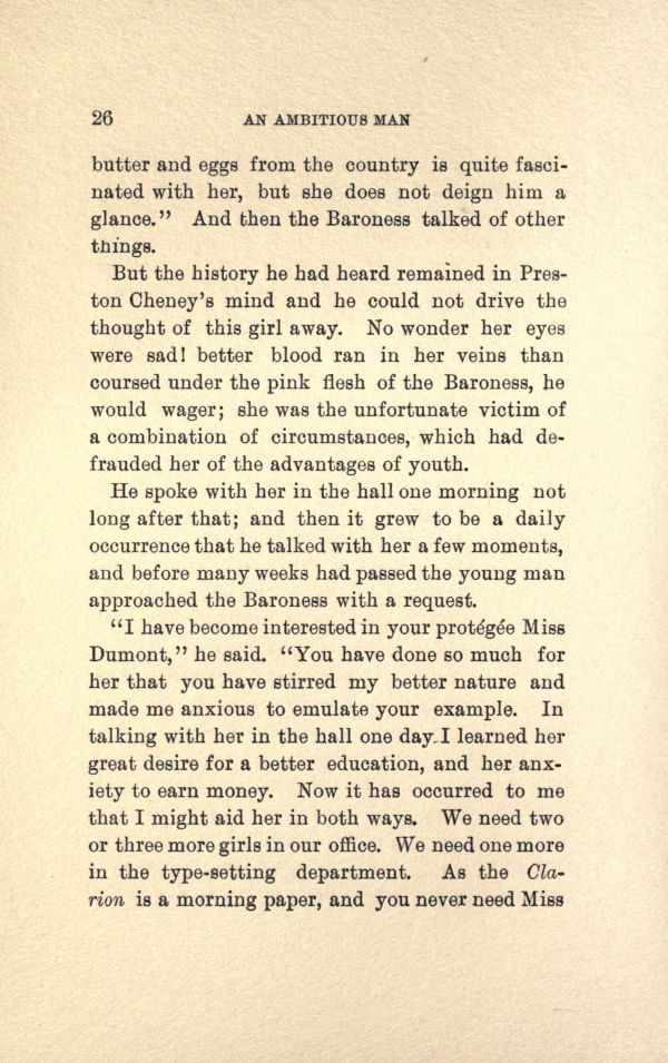 "I have become interested in your protegee Miss Dumont," he said. "You have done so much for her that you have stirred my better nature and made me anxious to emulate. your example. In talking with her in the ball one day I learned her great desire for a better education, and her anxiety to earn money. Now it has occurred to me that I might aid her in both ways. We need two or three more girls in our office. We need one more in the type-setting department. As the Clarion is a morning paper, and you never need Miss