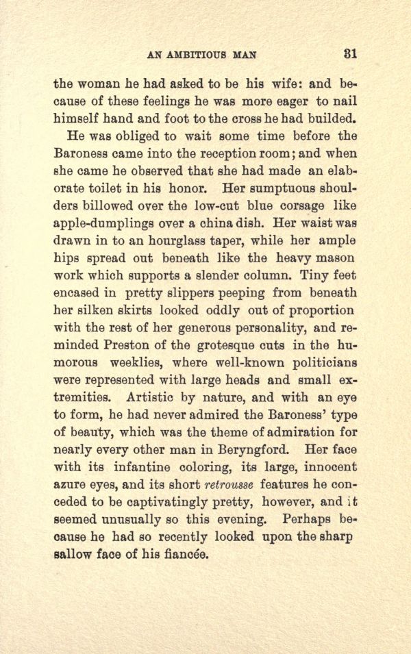 He was obliged to wait some time before the Baroness came into the reception room; and when she came be observed that she had made an elaborate toilet in his honor. Her sumptuous shoulders billowed over --- the low-cut blue corsage like apple-dumplings over a china dish. Her waist was drawn in to an hourglass taper, while her ample hips spread out beneath like the heavy mason work which supports a slender column. Tiny feet encased in pretty slippers peeping from beneath her silken skirts looked oddly out of proportion with the rest of her generous personality, and reminded Preston of the grotesque cuts in the humorous weeklies, where well-known politicians were represented with large heads and small extremities. Artistic by nature, and. with an eye to form, he had never admired the Baroness' type of beauty, which was the theme of admiration for nearly every other man in Beryngford. Her face with its infantine coloring, its large, innocent azure eyes, and its short retrousse features he conceded to be Captivatingly pretty, however, and it seemed unusually so this evening. Perhaps because he had so recently looked upon the sharp, sallow face of fiancee.