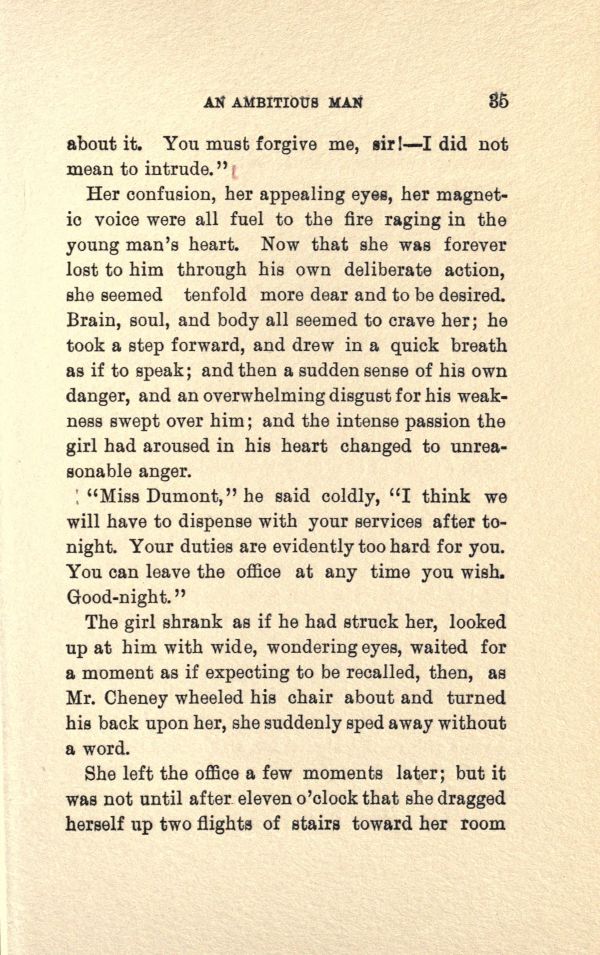 "Miss Dumont," he said coldly," I think we will have to dispense with your services after tonight. Your duties are evidently too bard for you. You can leave the office at any time you wish. Good-night.