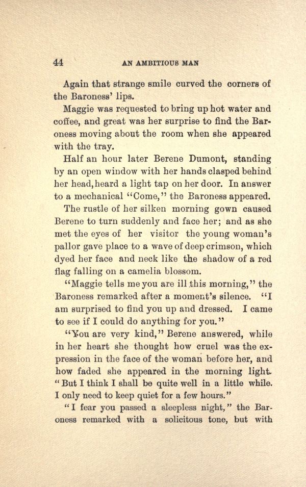 Half an hour later Berene Dumont, standing by an open window with her hands clasped behind her head, heard a light tap on her door. In answer to a mechanical " Come," the Baroness appeared.