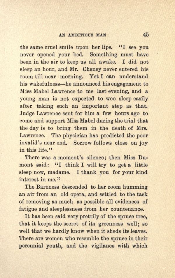 the same cruel smile upon her lips. "I see you never opened your bed. Something must have been in the air to keep us all awake. I did not sleep an hour, and Mr. Cheney never entered his room till near morning. Yet I can understand his wakefulness --- he announced his engagement to Miss Mabel Lawrence to me last evening, and a young man is not expected to woo sleep easily after taking such an important step as that. Judge Lawrence sent for him a few hours ago to come and support Miss Mabel during the trial that the day is to bring them in the, death of Mrs. Lawrence. The physician has predicted the poor invalid's near end. Sorrow follows close on joy in this life."