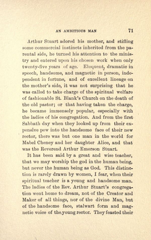 Arthur Stuart adored his mother, and stifling some commercial instincts inherited from the parental side, be turned his attention to the minis try and entered upon his chosen work when only twenty-five years of age. Eloquent, dramatic in speech, handsome, and magnetic in person, independent in fortune, and of excellent lineage on the mother's side, it was not surprising that be was called to take charge of the spiritual welfare of fashionable St. Blank's Church on the death of the old pastor; or that having taken the charge, be became immensely popular, especially with the ladies of his congregation. And from the first Sabbath day when they looked up from their expensive pew into the handsome face of their new rector, there was but one man in the world for Mabel Cheney and her daughter Alice, and that was the Reverend Arthur Emerson Stuart.