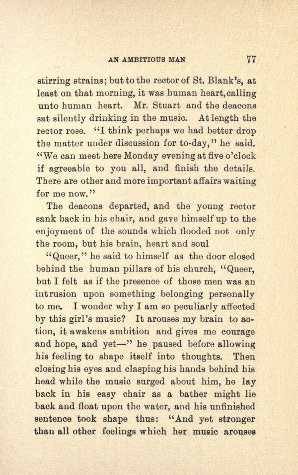"Queer," he said to himself as the door closed behind the human pillars of his church, "Queer, but I felt as if the presence of those men was an intrusion upon something belonging personally to me. I wonder why I am so peculiarly affected by this girl's music? It arouses my brain to action, it awakens ambition and gives me courage and hope, and yet'" he paused before allowing his feeling to shape itself into thoughts. Then. closing his eyes and clasping his hands behind his head while the music surged about him, he lay back in his easy chair as a bather might lie back and float upon the water, and his unfinished sentence took shape thus: "And yet Stronger than all other feelings which her music arouses