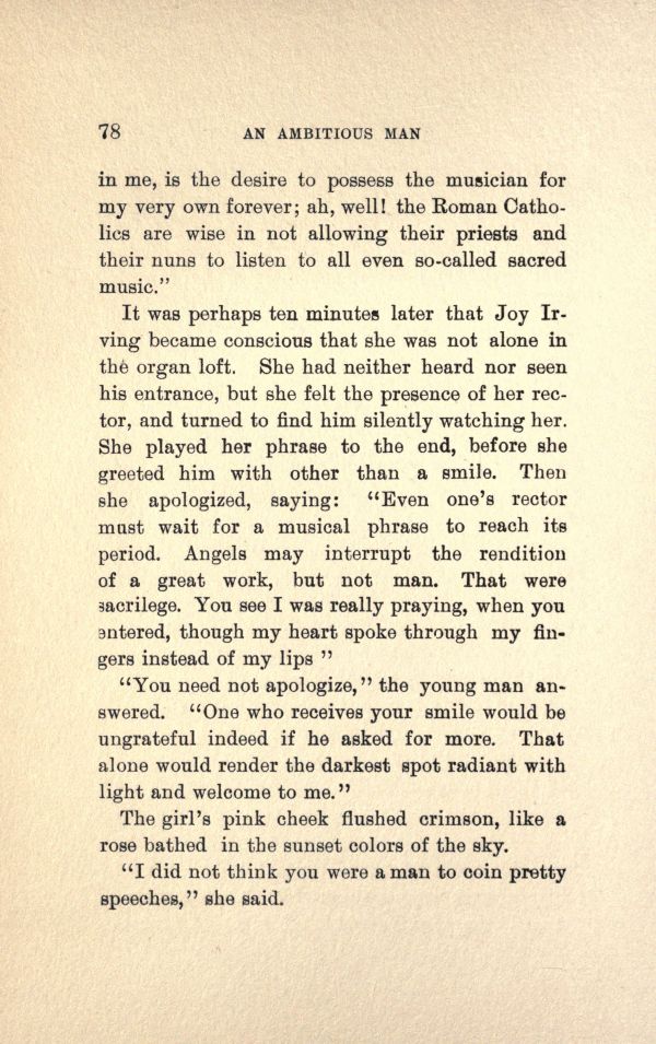 It was perhaps ten, minutes later that Joy Irving became conscious that she was not alone in the organ loft. She bad neither beard nor seen his entrance, but she felt the presence of her rector, and turned to find him silently watching her. She played her phrase to the end, before she greeted him with other than a smile. Then she apologized, saying: " Even one's rector must wait for a musical phrase to reach its period. Angels may interrupt the rendition of a great work, but not man. That were sacrilege. You see I was really praying, when you entered, though my heart spoke through my fingers instead of my lips."