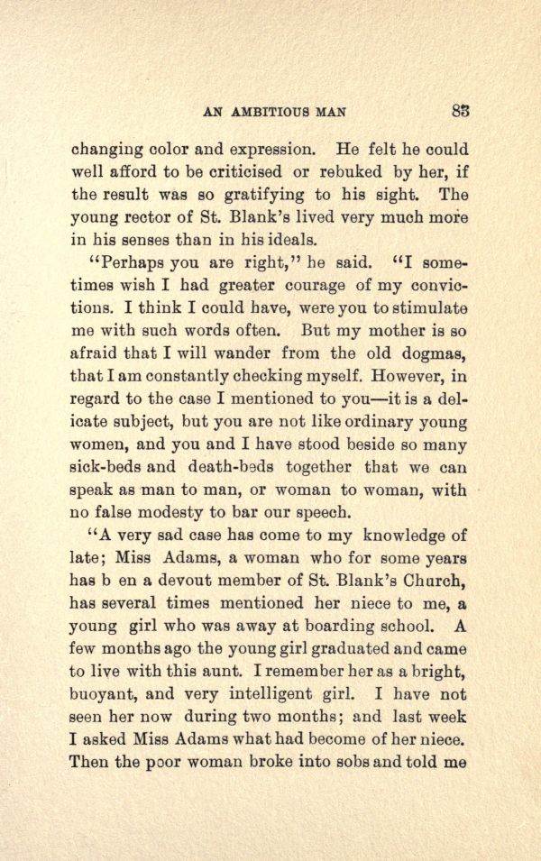 "Perhaps you are right," be said. " I sometimes wish I had greater courage of my convictions. I think I could have, were you to stimulate me with such words often. But my mother is so afraid that I will wander from the old dogmas, that I am constantly checking myself. However, in regard to the case I mentioned to you --- it is a delicate subject, but you are not like ordinary young women, and you and I have stood beside so many sick-beds and death-beds together that we can speak as man to man, or woman to woman, with no false modesty to bar our speech.