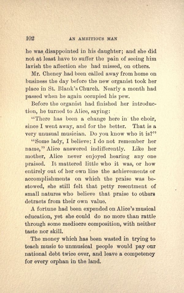 Mr. Cheney bad been called away from home on business the day before the new organist took her place in St. Blank's Church. Nearly a month had passed when he again occupied his pew.