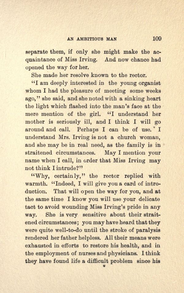 "I am deeply interested in the young organist whom I had the pleasure of meeting, some weeks ago," she said, and she noted with a sinking heart the light which flashed into the Man's face at the mere mention of the girl. "I understand her mother is seriously ill, and I think I will go around and call. Perhaps I can be of use. I understand Mrs. Irving is not a church woman, and she may be in real need, as the family is in straitened circumstances. May I mention your name when I call, in order that Miss Irving may not think I intrude?"