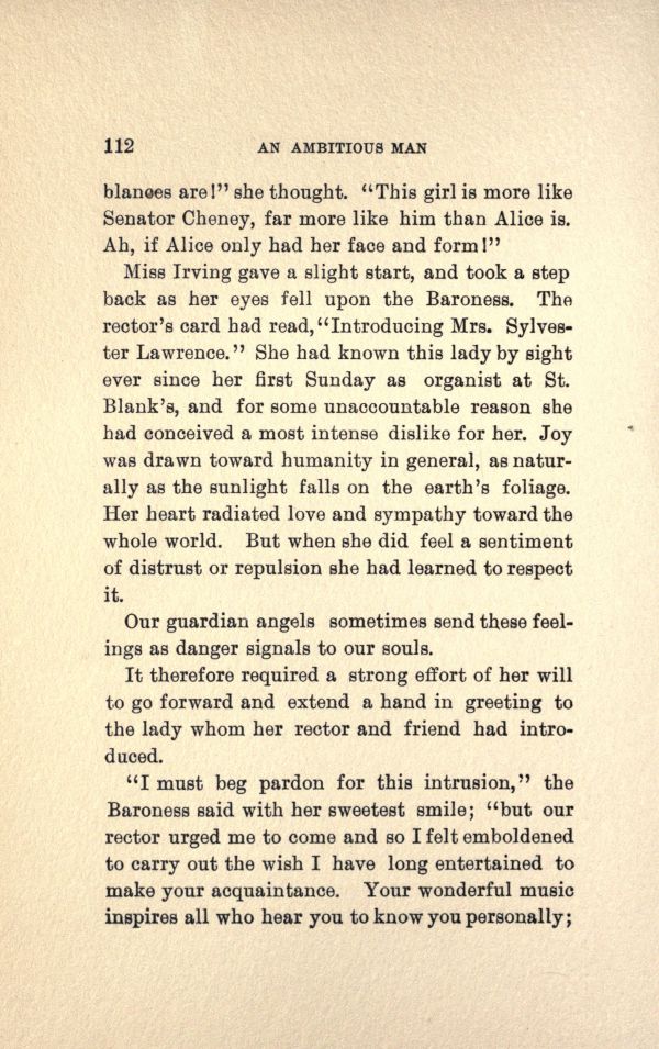Miss Irving gave a slight start, and took a step back as her eyes fell upon the Baroness. The rector's card had read, "Introducing Mrs. Sylvester Lawrence." She had known this lady by sight ever since her first Sunday as organist at St. Blank's and for some unaccountable reason she had conceived a most intense dislike for her. Joy was drawn toward humanity in general, as naturally as the sunlight falls on the earth's foliage. Her heart radiated love and sympathy toward the whole world. But when she did feel a sentiment of distrust or repulsion she bad learned to respect it.