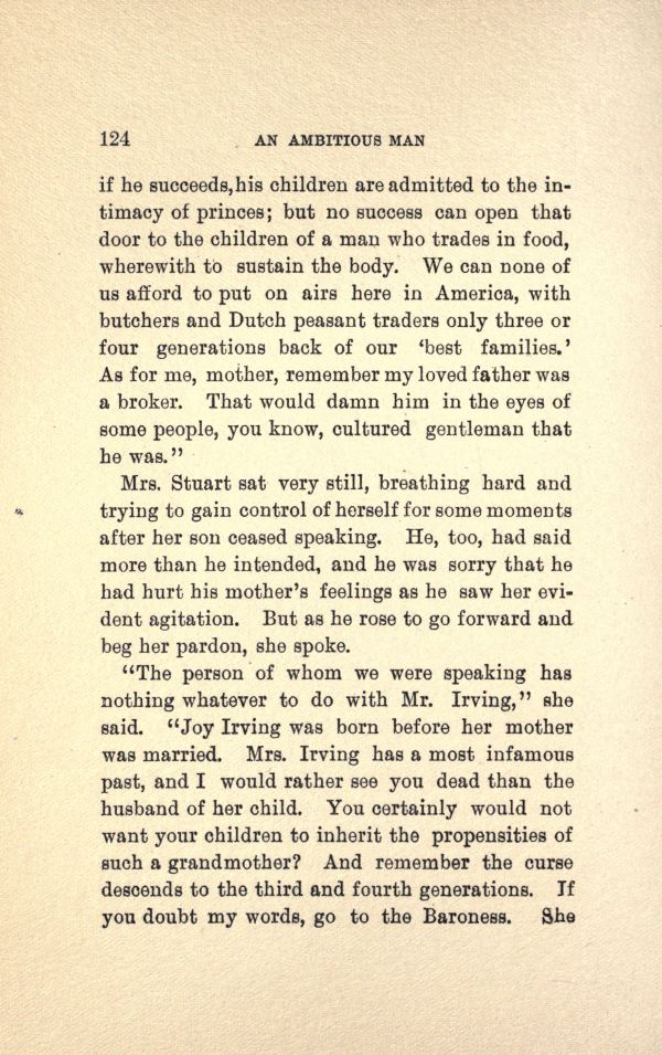 if he succeeds, his children are admitted to the intimacy of princes; but no success can open that door to the children of a man who trades in food, where with to sustain the body. We can none of us afford to put on airs here in America, with, butchers and Dutch peasant traders only three or four generations back of our 'best families.' As for me, mother, remember my loved father was a broker. That would damn him in the eyes of some people, you know, cultured gentleman that he was."