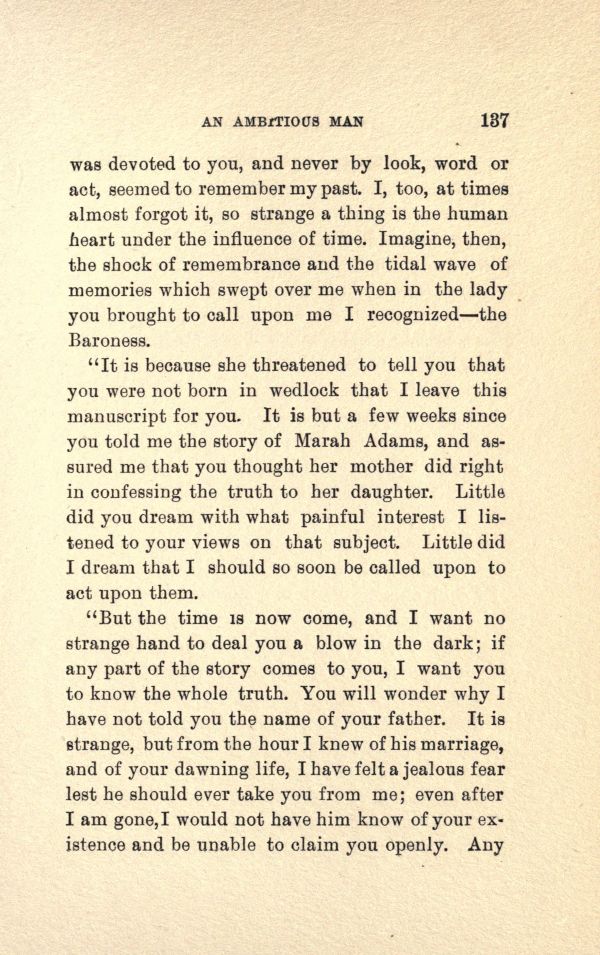 "It is because she threatened to tell you that you were not born in wedlock that I leave this manuscript for you. It is but a few weeks since you told me the story of Marah Adams, and assured me that you thought her mother did right in confessing the truth to her daughter. Little did you dream with what painful interest I listened to your views on that subject. Little did I dream that I should so soon be called upon to act upon them.