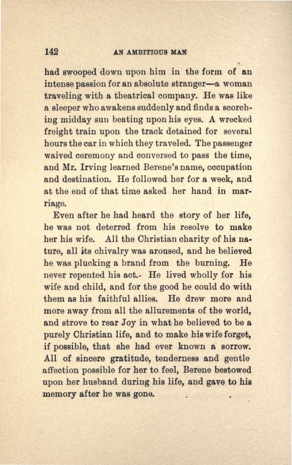 had swooped down upon him in the form of an intense passion for an absolute stranger --- a woman traveling with a theatrical company. He was like a sleeper who awakens suddenly and finds a scorching midday sun beating upon his eyes. A wrecked freight train upon the track detained for several hours the car in which they traveled. The passenger waived ceremony and conversed to pass the time, and Mr. Irving learned Berene's name, occupation and destination. He followed her for a week, and at the end of that time asked her band in marriage.