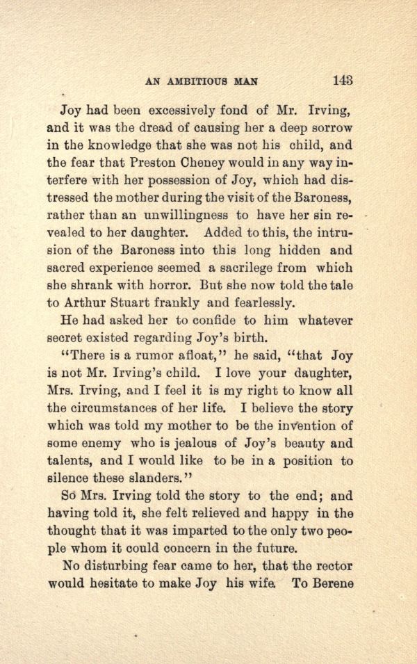 Joy had been excessively fond of Mr. Irving, and it was the dread of causing her a deep sorrow in the knowledge that she was not his child, and the fear that Preston Cheney would in any way interfere with her possession of Joy, which had dis tressed the mother during the visit of the Baroness, rather than an unwillingness to have her sin revealed to her daughter. Added to this, the intrusion of the Baroness into this long hidden and sacred experience seemed a sacrilege from which she shrank with horror. But she now told the tale to Arthur Stuart frankly and fearlessly.