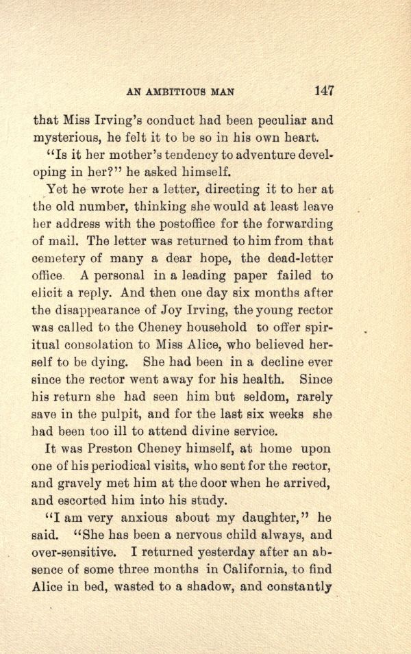 Yet be wrote her a letter, directing it to her at the old number, thinking she would at least leave her address with the post office for the forwarding of mail. The letter was returned to him from that cemetery of many a dear hope, the dead-letter office. A personal in a leading paper failed to elicit a reply. And then one day six months after the disappearance of Joy Irving, the Young rector was called to the Cheney household to offer spiritual consolation to Miss Alice, who believed her self to be dying. She had been in a decline ever since the rector went away for his health. Since his return she bad seen him but seldom, rarely save in the pulpit, and for the last six weeks she had been too ill to attend divine service.