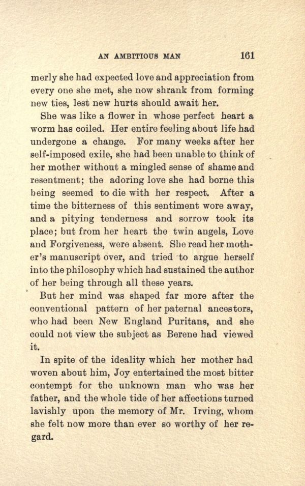 In spite of the ideality which her mother had woven about him, Joy entertained the most bitter contempt for the unknown man who was her father, and the whole tide of her affections turned lavishly upon the memory of Mr. Irving whom she felt now more than ever so worthy of her regard.