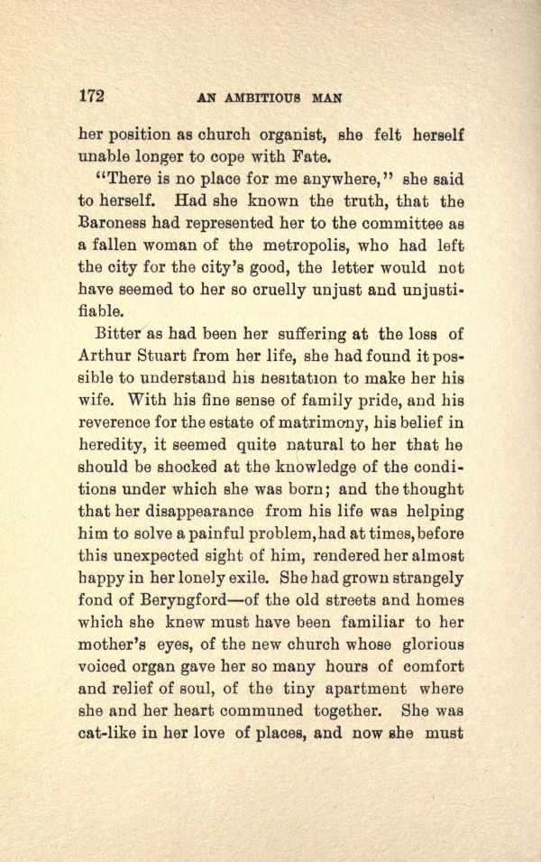 Bitter as had been her suffering at the loss of Arthur Stuart from her life, she had found it possible to understand his hesitation to make her his wife. With his fine sense of family pride, and his reverence for the estate of matrimony, his belief in heredity, it seemed quite natural to her that he should be shocked at the knowledge of the conditions under which she was born; and the thought that her disappearance from his life was helping him to solve a painful problem, had at times, before this unexpected sight of him, rendered her almost happy in her lonely exile. She had grown strangely fond of Beryngford --- of the old streets and homes which she knew must have been familiar to her mother's eyes, of the new church whose glorious voiced organ gave her so many hours of comfort and relief of soul, of the tiny apartment where she and her heart communed together. She was cat-like in her love of places, and now she must