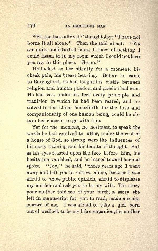 Yet for the moment, be hesitated to speak the words he had resolved to utter, under the roof of a house of God, so strong were the influences of his early training and his habits of thought. But as his eyes feasted upon the face before him, his hesitation vanished, and be leaned toward her and spoke. "Joy," be said, "three years ago I went away and left you in sorrow, alone, because I was afraid to brave public opinion, afraid to displease my mother and ask you to be my wife. The story your mother told me of your birth, a story she left in manuscript for you to read, made a social coward of me. I was afraid to take a girl born out of wedlock to be my life companion, the mother