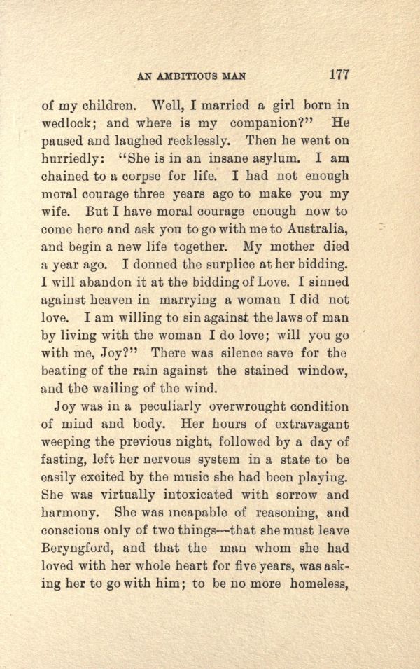 of my children. Well, I married a girl born in wedlock; and where is my companion?" He paused and laughed recklessly. Then be went on hurriedly: "She is in an insane asylum. I am chained to a corpse for life. I had not enough moral courage three years ago to make you my wife. But I have moral courage enough now to come here and ask you to go with me to Australia, and begin a new life together. My mother died a year ago. I donned the surplice at her bidding. I will abandon it at the bidding of Love. I sinned against heaven in marrying a woman I did not love. I am willing to sin against the laws of man by living with the woman I do love; will you go with me, Joy?" There was silence save for the beating of the rain against the stained window, and the wailing of the wind.