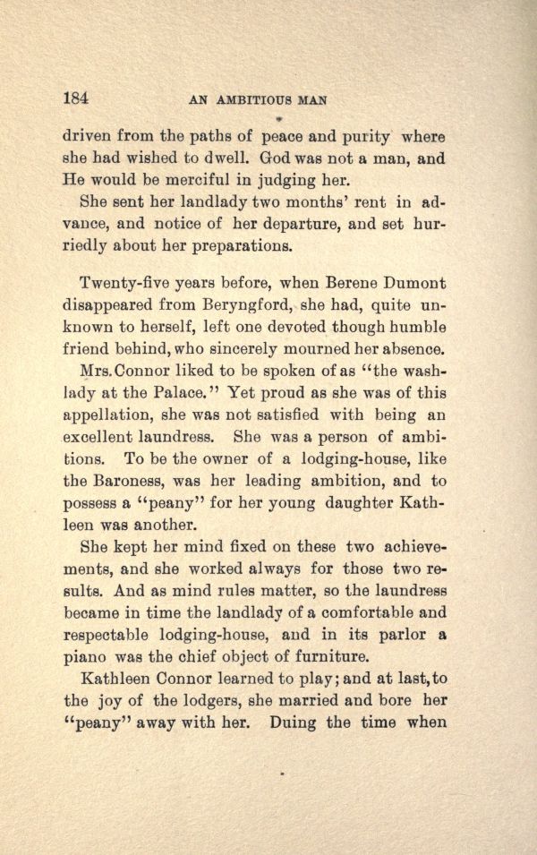 Mrs. Connor liked to be spoken of as "the wash-lady at the Palace." Yet proud as she was of this appellation, she was not satisfied with being an excellent laundress. She was a person of ambitions. To be the owner of a lodging-house, like the Baroness, was her leading ambition, and to possess a " peany" for her young daughter Kathleen was another.