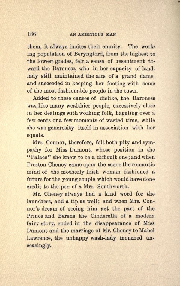 Mr. Cheney always had a kind word for the laundress, and a tip as well; and when Mrs. Connor's dream of seeing him act the part of the Prince and Berene the Cinderella of a modern fairy story, ended in the disappearance of Miss Dumont and the marriage of Mr. Cheney to Mabel Lawrence, the unhappy wash-lady mourned unceasingly.