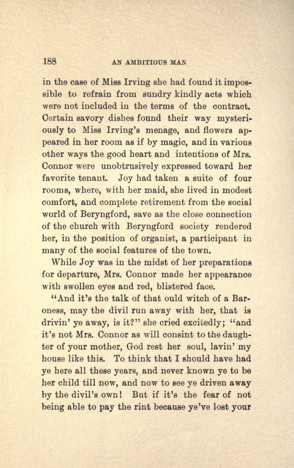 in the case of Miss Irving she had found it impossible to refrain from sundry kindly sets which were not included in the terms of the contract. Certain savory dishes found their way mysteriously to Miss Irving's menage, and flowers appeared in her room as if by magic, and in various other ways the good heart and intentions of Mrs. Connor were unobtrusively expressed toward her favorite tenant. Joy had taken a suite of four rooms, where, with her maid, she lived in modest comfort, and complete retirement from the social world of Beryngford, save as the close connection of the church with Beryngford society rendered her, in the position of organist, a participant in many of the social features of the town.