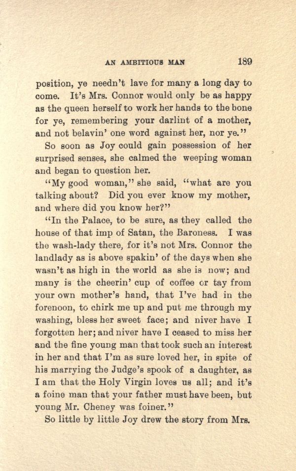 "In the Palace, to be sure, as they called the house of that imp of Satan, the Baroness. I was the wash-lady there, for it's not Mrs. Connor the landlady as is above spoken' of the days when she wasn't as high in the world as she is now; and many is the cheerin' cup of coffee or tay from your own mother's hand, that I've had in the forenoon, to chirk me up and put me through my washing, bless her sweet face; and niver have I forgotten her; and niver have I ceased to miss her and the fine young man that took such an interest in her and that I'm as sure loved her, in spite of his marrying the Judge's spook of a daughter, as I am that the Holy Virgin loves us all; and it's a foine man that your father must have been, but young Mr. Cheney was foiner."