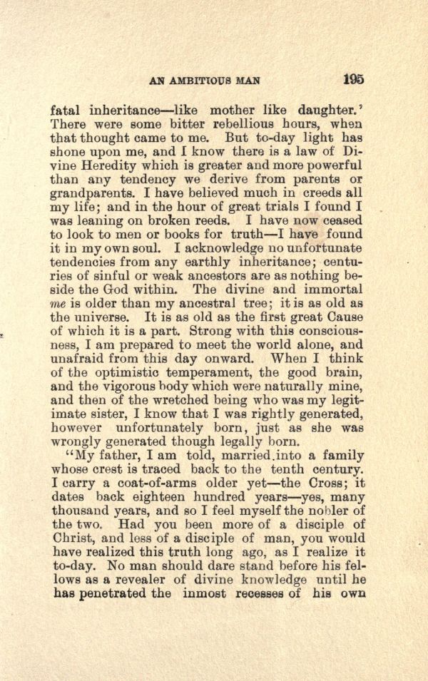 fatal inheritance --- like mother like daughter.' There were some bitter rebellious hours, when that thought came tome. But to-day light has shone upon me, and I know there is a law of Divine Heredity which is greater and more powerful than any tendency we derive from parents or grandparents. I have believed much in creeds all my life; arid in the hour of great trials I found I was leaning on broken reeds. I have now ceased to look to men or books for truth --- I have found it in my own Soul. I acknowledge no unfortunate tendencies from any earthly inheritance; centuries of sinful or weak ancestors are as nothing be side the God within. The divine and immortal me is older than my ancestral tree; it is as old as the universe. It is as old as the first great Cause of which it is a part. Strong with this consciousness, I am prepared to meet the world alone, and unafraid from this day onward. When I think of the optimistic temperament, the good brain, and the vigorous body which were naturally mine, and then of the wretched being who was my legitimate sister, I know that I was rightly generated, however unfortunately born, just as she was wrongly generated though legally born.