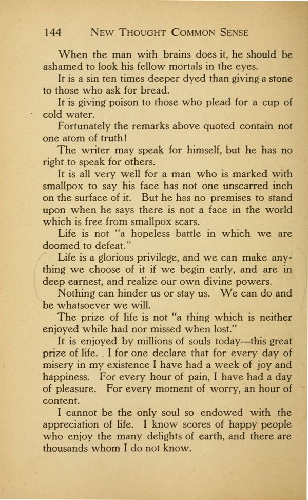 The Ancient Lineage of New Thought - The Anti-toxin of Common Sense - Are You Doing the Best You Can? - Be Not Easily Offended - For What Are You Living? - Ignore Misfortune - The Power of Personality - Common Sense and "Goodness" - "Good Business" - The Trapeze Performer - The High Calling of Fatherhood - The High Calling of Motherhood - Thought Building for Children - The New Thought Economy - What Is a Good Woman? - The Color of Your Thoughts - "In God We Trust" - Are You Alive? - Something About Celibacy - The Old and the New Thought View of Life - The Cities Beyond - The Onward March - Common Sense Ideas in Marriage - The Shading of the Picture - Woman and the Cigarette - Sinning Against the "Holy Ghost" - New Thoughts and Beauty - Famous and Infamous Women - Enemies to Happiness - The New Year - Enthusiasm - Brace Up - Universal Need - Every Day Opportunities - The Masters - Building Kindness Cells - What Is Optimism? - What Is the Loving Thing to Do? - A New Thought Rosary - Unto the End - Keep Still and Wait - What Life Means to Me - Contents - Index