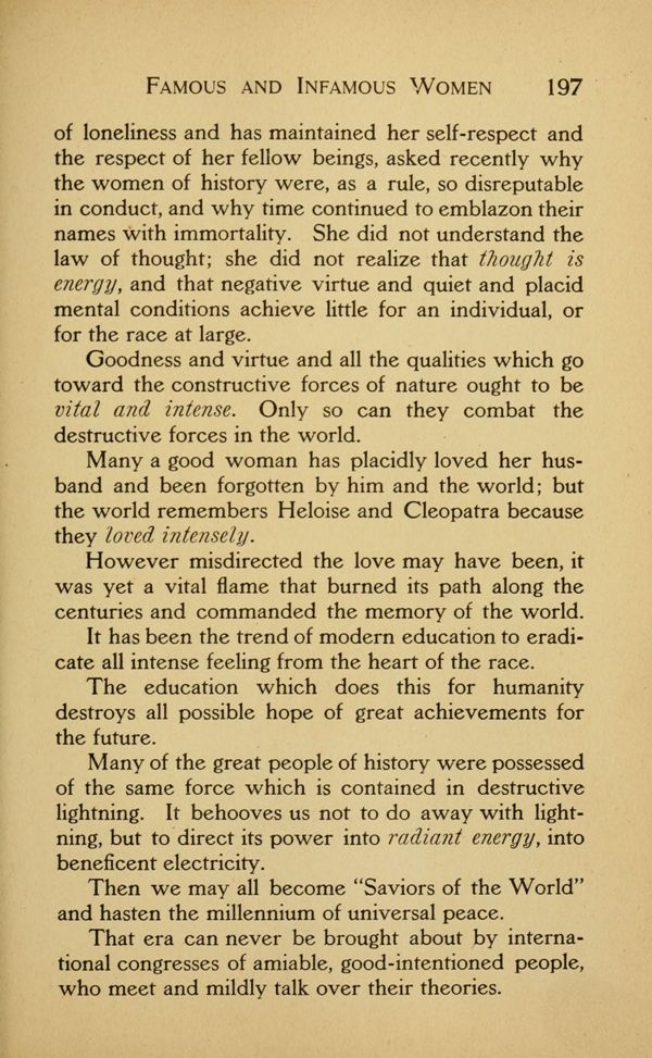 of loneliness and has maintained her self-respect and the respect of her fellow beings, asked recently why the women of history were, as a rule, so disreputable in conduct, and why time continued to emblazon their names with immortality. She did not understand the law of thought; she did not realize that thought is energy, and that negative virtue and quiet and placid mental conditions achieve little for an individual, or for the race at large.