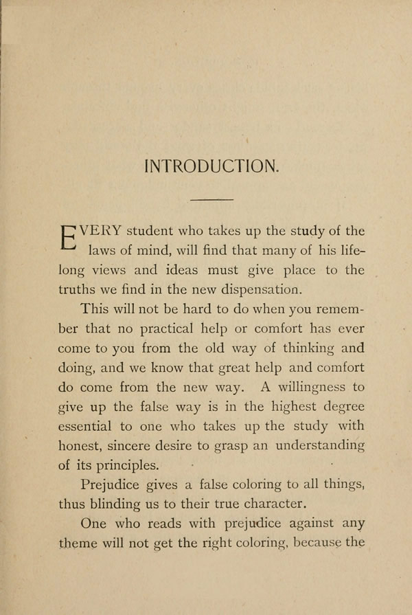 Every student who takes up the study of the laws of mind, will find that many of his lifelong views and ideas must give place to the truths we find in the new dispensation. This will not be hard to do when you remember that no practical help or comfort has ever come to you from the old way of thinking and doing, and we know that great help and comfort do come from the new way. A willingness to give up the false way is in the highest degree essential to one who takes up the study with honest, sincere desire to grasp an understanding of its principles.