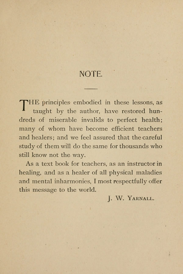 The principles embodied in these lesson, as taught by the author, have restored hundreds of miserable invalids to perfect health; many of whom have become efficient teachers and healers; and we feel assured that the careful study of them will do the same for thousands who still know not the way.