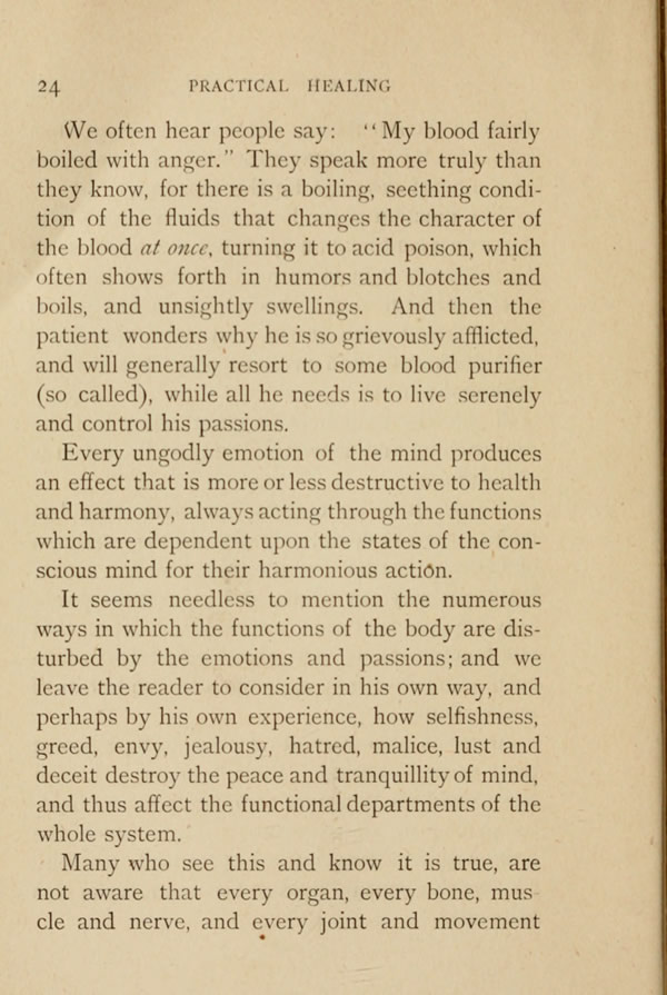 We often hear people say: "My blood fairly boiled with anger," They speak more truly than they know, for there is a boiling, seething condition of the fluids that changes the character of the blood at once, turning it to acid poison, which often shows forth in humors and blotches and boils, and unsightly swellings. And then the patient wonders why he is so grievously afflicted, and will generally resort to some blood purifier (so called), while all he needs is to live serenely and control his passions.